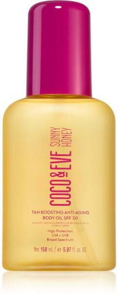 Coco & Eve Sunny Honey Tan Boosting Anti-Aging Body Oil SPF 30, 150 ml, Napsugárzás elleni védekezés nőknek, Védje bőrét a napsugárzás okozta idő előtti öregedéstől és egyéb károsodásoktól. Az arc finom bőre sokkal érzékenyebb, mint a test többi részén lévő bőr, és egész évben ki van téve a napsugaraknak – ezért fontos, hogy nem becsülje alá a védelmét.