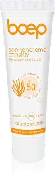 Boep Natural Sun Cream Sensitive, 50 ml, Napvédő kozmetikumok gyermekeknek gyermekeknek, A gyermekek bőre rendkívül érzékeny a napsugarakra, ezért fontos, hogy kellően hatékony és megbízható védelmet biztosítsunk számukra. A minőségi Boep Natural Sun Cream Sensitive napvédő gondoskodik erről. A hatékony UV-szűrők kombinációja megakadályozza a káros napfény okozta irrit
