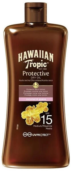 Hawaiian Tropic Protective Dry Oil száraz napolaj SPF15, 100 ml - A Hawaiian Tropic Protective Dry Oil széles spektrumú UVA és UVB védelmet nyújt 15-ös faktor mellett - Az egyedülálló kókuszdió- és papaya-összetétel nemcsak csodálatos illatot garantál, de az olaj könnyű felszívódását, valamint a bőr puhaságát és hidratáltságának védelmét is - Nincs több kellemetlen