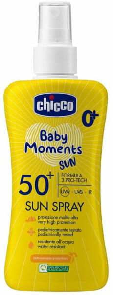 Chicco SUN SPRAY SPF 50+ (150ml) Fényvédő spray 0hó+ FORMULA 3 PRO-TECH: UVA - UVB – INFRA sugárzás elleni védelem Kiszerelés: 150 ml Életkor: 0hó+ Nagyon magas védelem SPF50+. Gyermekgyógyászatilag tesztelt. Érzékeny bőrön tesztelt. Vízálló. Alkohol mentes. Illatanyag mentes. 3 PRO-TECH fejlett fényvédő komplexum a bőr mély védelmére a napsugárzás ellen. Az SPF 50+