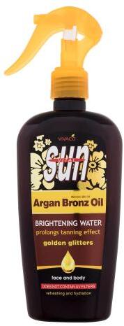 A Vivaco Sun Argan Bronz Oil Brightening Water bőrélénkítő arany csillámokkal gazdagított, UV-szűrőket nem tartalmazó napozópermet a tirizinnek köszönhetően gyorsítja a barnulást. Amiért a Vivaco csillogó részecskéket tartalmazó napozópermet imádnivaló bőrélénkítő arany csillámokkal, szexi bronzos árnyalatot ad a bőrnek, frissítő és hidratáló papájakivonattal,