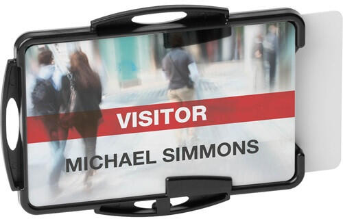 Biztonsági kártyatartó Durable ECO két kártya számára fekete Nyitott kártyatartó két kártya tárolására. Álló vagy fekvő formátumban is használható. Lánccal, textilszalaggal vagy kihúzható tartóval kombinálható. Újrafelhasznált alapanyagból készült a Blue Angel igazolásnak megfelelő minőségben.