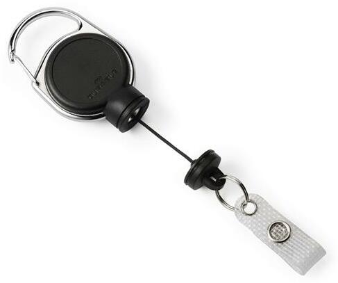 Azonosítókártya-tartó, kihúzható, patentos, DURABLE "Extra Strong", fekete - DB832901 - Azonosítókártyák és tartozékaik - Extra erős kihúzható kártyatartó mágnessel. -karabínerrel rögzíthető ruházathoz, táskához -extra erős orsó megerősített zsinórral és