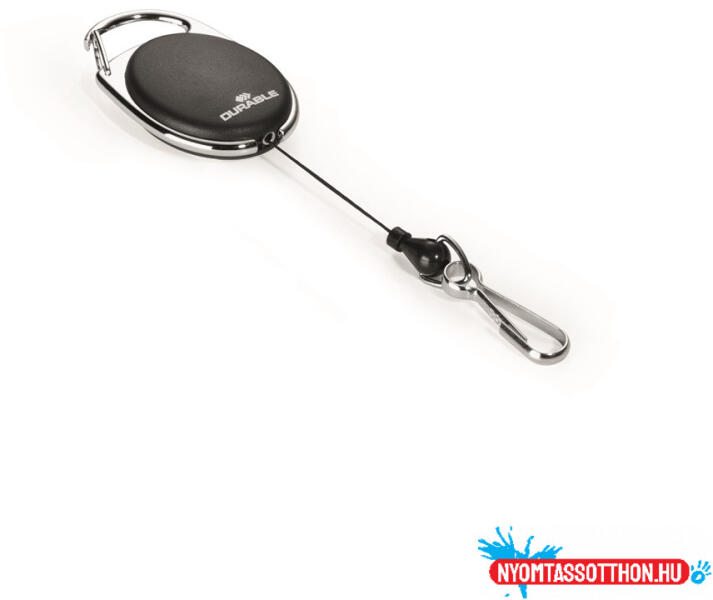 Névjegykártyatartó kihúzható karabineres, Durable with Snap Hook fekete Ovális, kihúzható névkitűzőtartó, fém klippel, széles színválasztékban. A biztonsági kártya mindig kéznél van. Minden lyukasztott DURABLE névtartóhoz használható. Karabineres rögzítéssel.
