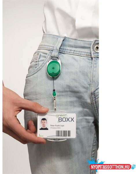 Névjegykártyatartó kihúzható karabineres, Durable with Snap Hook zöld Ovális, kihúzható névkitűzőtartó, fém klippel, széles színválasztékban. A biztonsági kártya mindig kéznél van. Minden lyukasztott DURABLE névtartóhoz használható. Karabineres rögzítéssel.