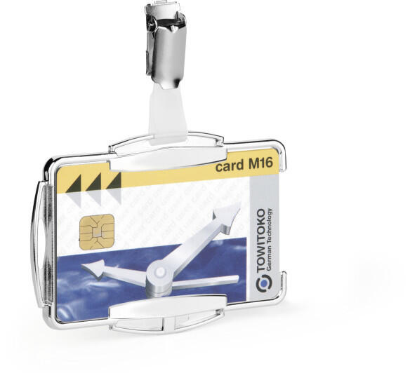 A kártyatartó védelmet nyújt adatainak illetéktelenek által történő leolvasásával szemben. RFID kártyatartó 1 kártyához Védelmet nyújt 13.56 MHz-en Álló és fekvő formátumban is használható Forgatható csipesszel Kombinálható lánccal, textilszalaggal, vagy kihúzható tartóval Belső méret: 54 x 87 mm Katalóguskód: 26308