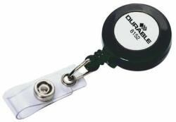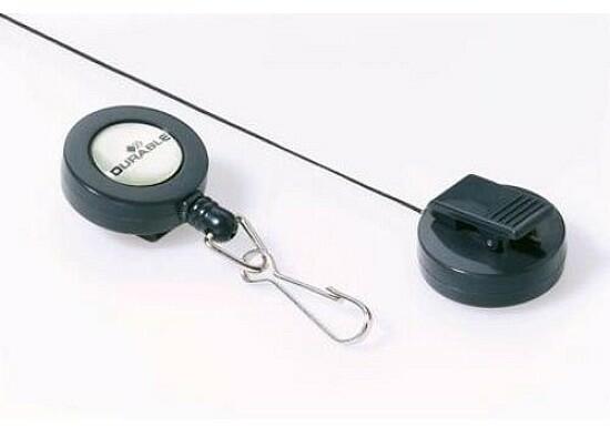 Feltekerő mechanizmussal rendelkező, műanyag krokodilcsipesszel ellátott. Névkitűző tartó igazolványtartókhoz, névjegykártyatartókhoz, 85 cm hosszú zsinórral.