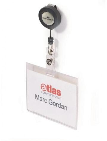 Tömör átlátszó PVC-ből készült címke visszahúzható tekercssel, amely 80 cm-re meghosszabbítható. A heveder zárása után a névcímke nem távolítható el. Papír névtáblával szállítjuk. Csere papírok DU145602. 10 db-os csomag. Méretek: 90×60 mm