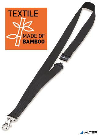 Megújuló nyersanyagból, bambuszból készült textilszalag biztonsági zárral, mely elakadás esetén kiold. -felhasználási terület: kulcstartónak, vagy olyan névkitűzőkhöz vagy biztonsági kártyatartókhoz, melyek klip-kivágással rendelkeznek -a csatos rögzítés -karabineres végződés -fekete színű -anyag: bambusz -méret: 44 x 2 cm (ho x szé) Itt megtekinthető és letölth