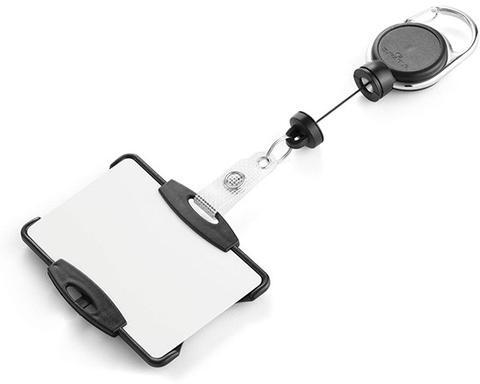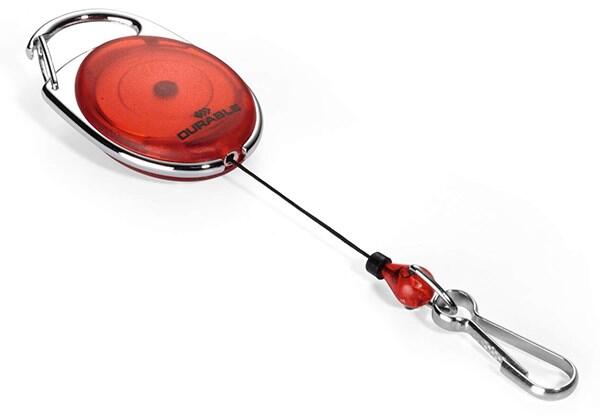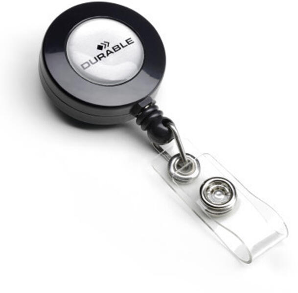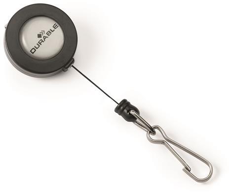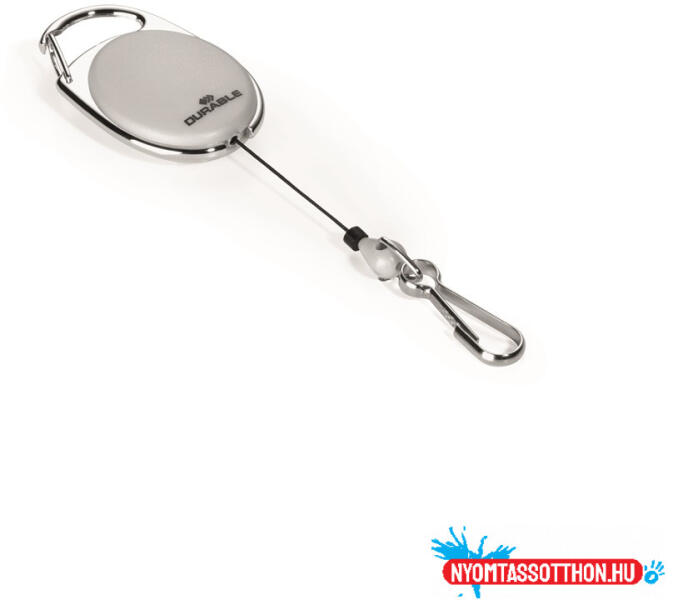 Névjegykártyatartó kihúzható karabineres, Durable with Snap Hook szürke Ovális, kihúzható névkitűzőtartó, fém klippel, széles színválasztékban. A biztonsági kártya mindig kéznél van. Minden lyukasztott DURABLE névtartóhoz használható. Karabineres rögzítéssel.
