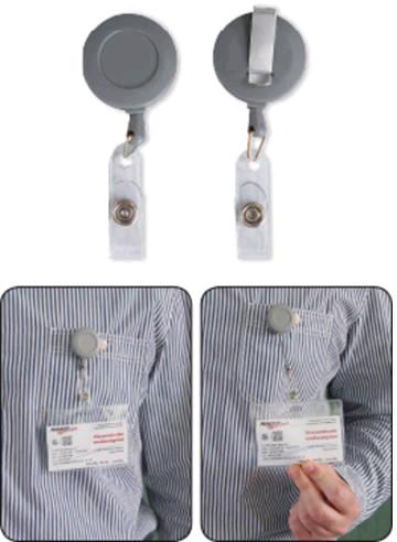 Biztonsági kártyatartó, kivágással a hátlapon a kártyák könnyű cserélhetősége érdekében. Álló és fekvő formátumban is használható. Kombinálható klippel, lánccal, textilszalaggal vagy kihúzható tartóval.