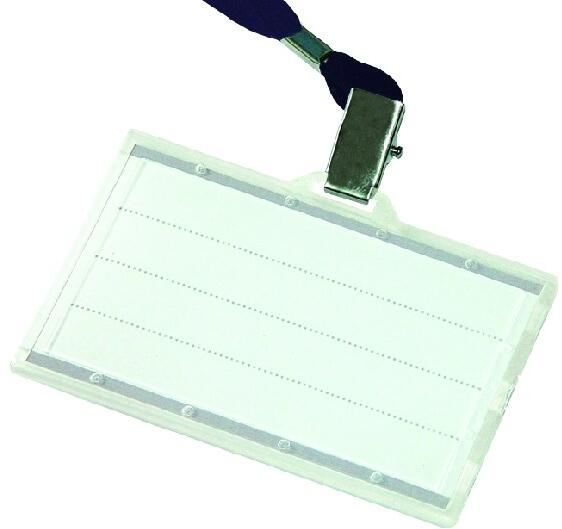 Azonosítókártya tartó krokodil csipesszel, 84 cm hosszú fekete nyakba akasztóval, rugalmas polipropilénből. A hátulján lévő ovális nyílás megkönnyíti a kártya kivételét, cseréjét.