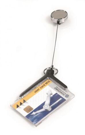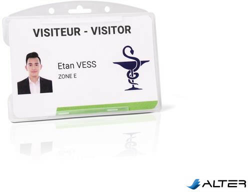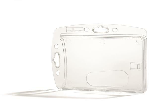 Biztonsági kártyatartó két kártya számára. Álló és fekvő formátumban is használható. Kombinálható csipesszel, lánccal, textil szalaggal vagy kihúzható tartóval. Méret: 54 x 85 mm