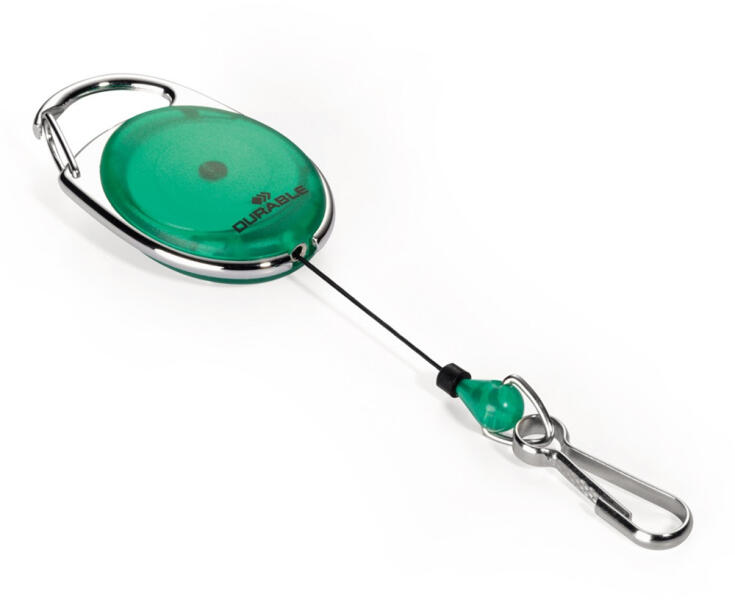 Kihúzható névjegytartó DURABLE WITH SNAP HOOK karabineres zöld Ovális, kihúzható névkitűzőtartó, fém klippel, széles színválasztékban. A biztonsági kártya mindig kéznél van. Minden lyukasztott DURABLE névtartóhoz használható. Karabineres rögzítéssel. Katalóguskód: 27218