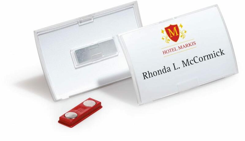 -Névkitűző kombiklippel, ruhához rögzíthető vagy felcsíptethető -Különösen alkalmas sok személynek való kiosztásra, pl. konferenciákon és nagy rendezvényeken, melyeken a táblákat gyakran nem szolgáltatják vissza