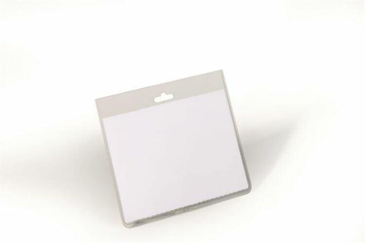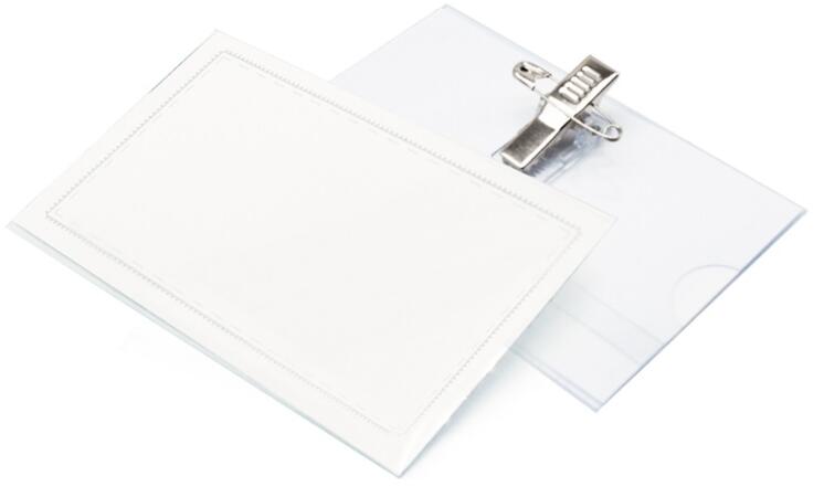 "Víztiszta, kemény PVC-ből készült névjegykártyatartó. Az oldalán nyitott, így a névjegykártyák könnyen kivehető. Üres névjegykártya lapok. Biztosító tűvel és csíptetővel ellátott kivitel. " 50db/doboz, 90x56 mm, 25MIC Katalóguskód: 18856
