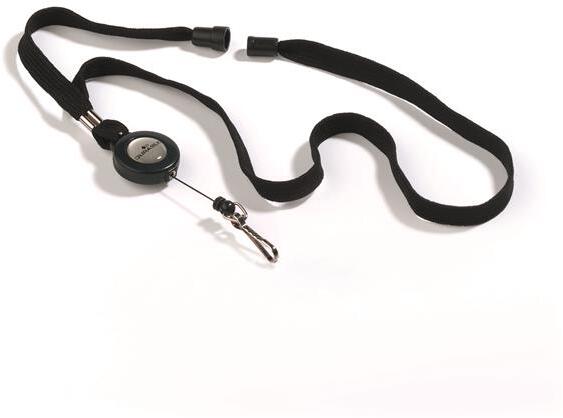 Azonosítókártya-tartó, nyakba akasztható, biztonsági csattal, DURABLE, fekete - DB813701 - Névkitűzők és tartozékaik - Biztonsági kioldóval ellátott nyakba akasztható textil szalag, kihúzható tartóval. -ideális kulcstartónak, vagy olyan névkitűzőkhöz ill.