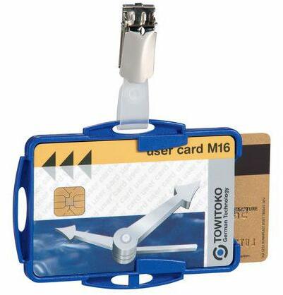 Kemény tok fém kapcsos mágneskártyához vagy biztonsági kártyához. A biztonsági információk közvetlenül a fedetlen oldalról olvashatók. A jelvénytartó kombinálható orsóval, zsinórral vagy lánccal. Két lyukkal rendelkezik, így vízszintesen is hordható vagy függőlegesen.