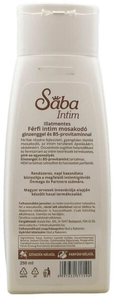 A Sába férfi intim szappan a férfiak intim bőrfelületeinek természetes védelmét segíti a bőr élettani pH 4-es értékének visszaállításával és fenntartásával. 250 ml-es intim szappan; Sába termék az intim higiéniáért - férfiak részére.