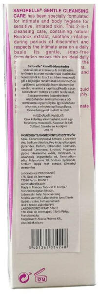 Ez a gél a test, és az intim testrészek tisztítására, ápolására való szappanmentes mosakodó oldat enyhén lúgos pH-val, mely csillapítja és nyugtatja az irritációt. 250 ml-es gél; Saforelle termék az intim higiéniáért.
