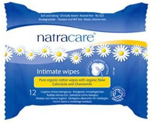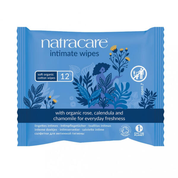 Tiszta bio pamut törlőkendők körömvirág és kamillavirág természetes kivonataival. 12 db-os intim törlőkendő; Natracare termék az intim higiéniáért.
