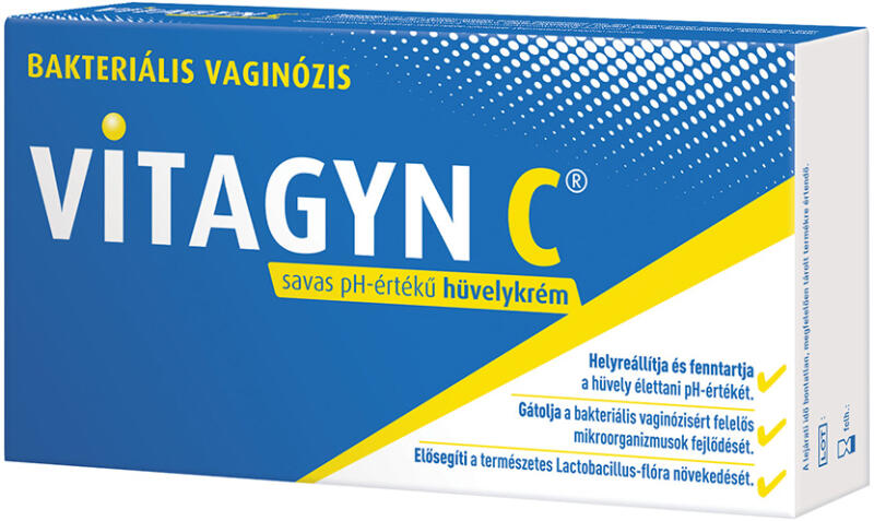 Egy doboz Vitagyn C® savas pH-értékű hüvelykrém egy 30 g tartalmú tubust és 6 db egyszer használatos applikátort tartalmaz. Bakteriális vaginózis és visszatérő húgyúti fertőzések kezelésének és megelőzésének kiegészítésére. Alkalmazása különösen hasznos visszaesés esetén, ill. antibiotikumokkal történt kezelést követően. A Vitagyn C® savas pH-értékű hüv