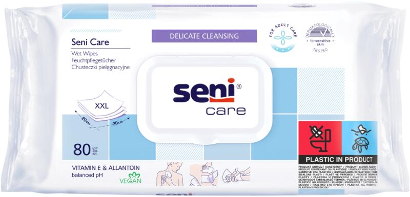 A Seni Care puha, nedves törlőkendő a gyengéd tisztításon felül helyreállítja a bőr rugalmasságát és gyorsítja a regenerációt. Praktikus visszazárható csomagolással, műanyag zárófedéllel, így a törlőkendők a nedvességet kitűnően tartják. Felnőtt méret, extra nagy felület (30x20 cm). Gyulladásgátló hatású E-vitaminnal és bőrpuhító allantoinnal.