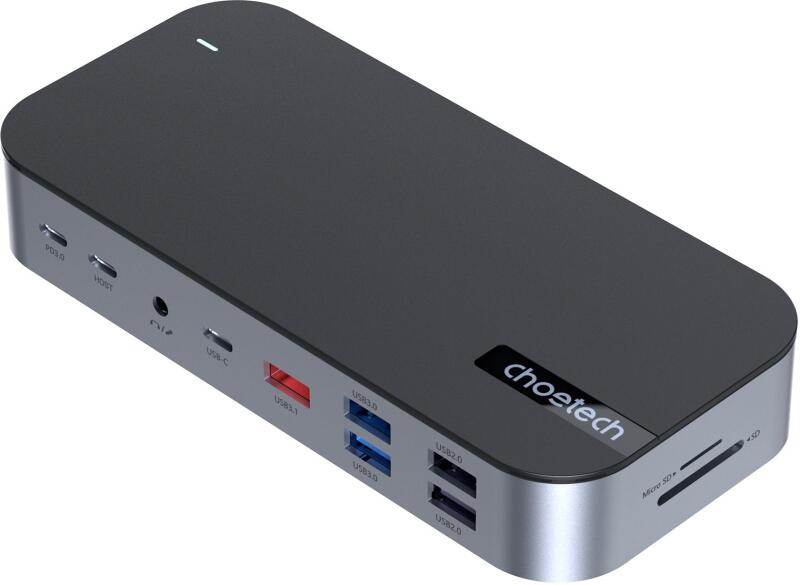 HUB Choetch M52 USB-C – USB-C PD/USB-C/USB-A/HDMI/VGA/DP/SD/TF/RJ45/AU X – szürke Volt már olyan probléma egy asztali vagy laptop számítógéppel, amikor nem volt szabad port további eszközök csatlakoztatására? A szabványos USB-csatlakozók kis száma frusztráló lehet. A Choetech HUB-M52 nem csak ezt a problémát oldja meg. A többfunkciós HUB számos más kényelmes megoldást