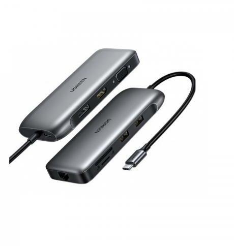 UGREEN 70301 9 az 1-ben Adapter hub USB-C - HDMI, DP, VGA, 2xUSB3.0, RJ45, SD/TF, PD(szürke)Bemutatjuk a UGREEN 9 az 1-ben adaptert - sokoldalú megoldás mindenkinek, aki értékeli a mobilitást, a teljesítményt és az elegáns dizájnt. Ez a kompakt USB-C hub tökéletes kiegészítő a szakemberek, diákok és multimédia-rajongók számára, akiknek megbízható kapcsolatra van szükségü
