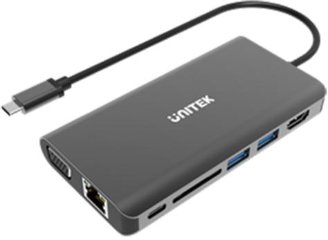 Multiport USB HUB TYPE C 8in1 UNITEK HUB 8W1 USB3.1 TYPE-C WITH POWER DELIVERY 100W is a universal port replicator for a computer equipped with a USB Type-C port. Thanks to the Unitek product - by connecting to one USB C port we get the following ports and functions: 1 x HDMI v1.4 1 x VGA 1 x RJ45 (Gigabit Ethernet) 2 x USB 3.0 ports 1 x USB C with Power Delivery function 1 x SD card reader 1 x 3.