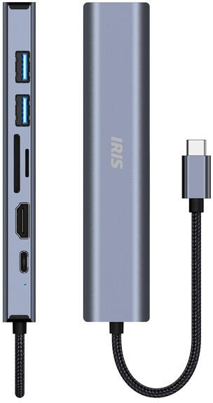 Iris IH6-23 7in1 Dokkoló Csatalkozás tipusa: Type-C Méret: 13,6 x 2,8 x 1,4 cm Ház anyaga: Aluminium 1 x Ethernet 1 x HDMI 4K 30hz 1 x Micro SD 1 x SD kártya olvasó 1 x USB-C PD 100W 2 x USB-A 3.0
