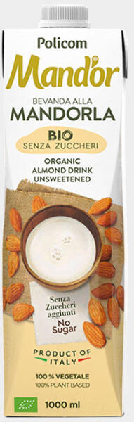 Bio, vegán, kóser, halal, gluténmentes, cukormentes, laktózmentes, GMO mentes. A mandula Olaszországban termett. 1000 ml A Policom által készített biotermék egy hozzáadott cukrot és édesítőszert nem tartalmazó mandulaital, az összetevők tiszta és kiegyensúlyozott kombinációja.