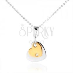 925 ezüst nyakék, delfinkapoccsal, ferdén összekapcsolt, elipszis alakú szemekből álló láncból és két medálból lapos és fényes szív alakban, amelyeken egy láncra kerülő szem van keresztül fűzve. A nagyobb szív ezüst színű a kisebb pedig arany árnyalatú és az alsó részbe egy átlátszó cirkónia van ültetve. A nyakllánc hossza állítható. A medál méretei: 12 x