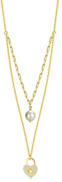 Az arany színben készült 925 ezüst nyaklánc egy lánccal, amely kis ovális láncszemekből áll, amelyek függőlegesen kapcsolódnak egymáshoz. A láncra egy szív alakú lakat medál van erősítve, amely átlátszó cirkóniákkal van kirakva, közepén egy kis sima és fényes csillaggal. A másik lánc lapos, fazettált ellipszis alakú láncszemekből áll, amelyeken egy fehér, sima,
