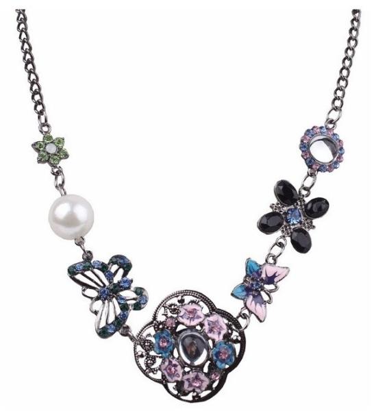 Állítható hosszúságú nyakék, pillangóval, csiszolt színes kövekkel, gyönggyel díszítve. Alkalmakra, mindennapokra, elegáns és alkalmi öltözethez. TULAJDONSÁGOKstrasszokkal díszítve különböző medálok állítható hosszMÉRETEKnyaklánc hossz: állítható: 46 - 52 cm-ig