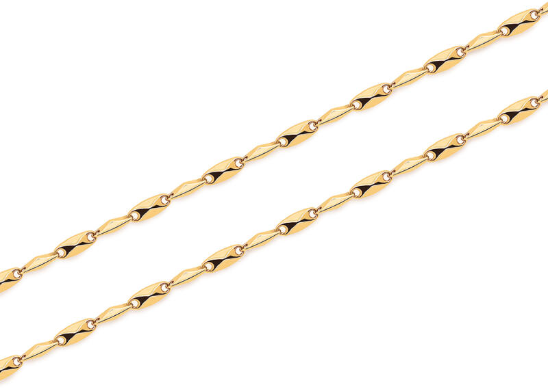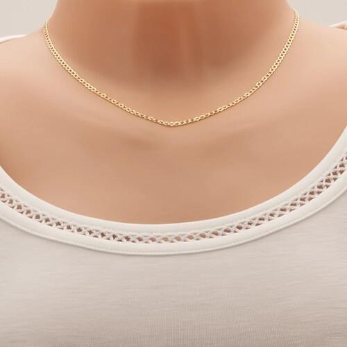 Nyaklánc 14K sárga aranyból csillogó lapos ovális szemekből, melyek apró kivályt lyukacskákkal díszítettek a kapcsolásuknál. Kerek kapoccsal rendelkezik . A lánc vastagsága: 2,40 mm A lánc hossza: 450 mm (+/- 5 %) A záróláncszem szélessége: 2,4 mm A lánc súlya: 2,03 g Fémjelzéssel ellátott.