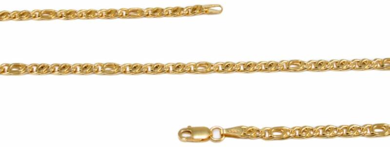 Modern stílusú, kedvelt fazonú, üreges, de masszív kialakítású, 3+1 szemkötésű "scharless" típusú aranylánc.