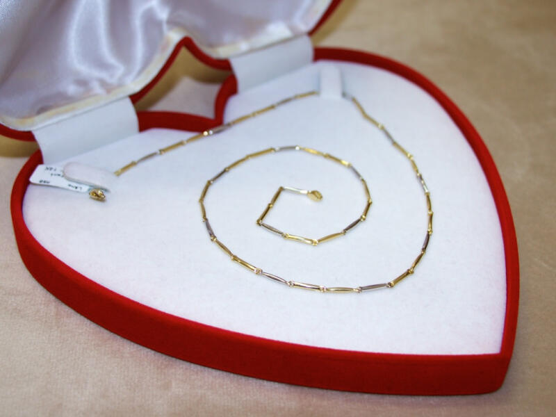 Modern stílusú, kedvelt fazonú, üreges, hosszúkás szemekből álló, ródiummal díszített aranylánc.