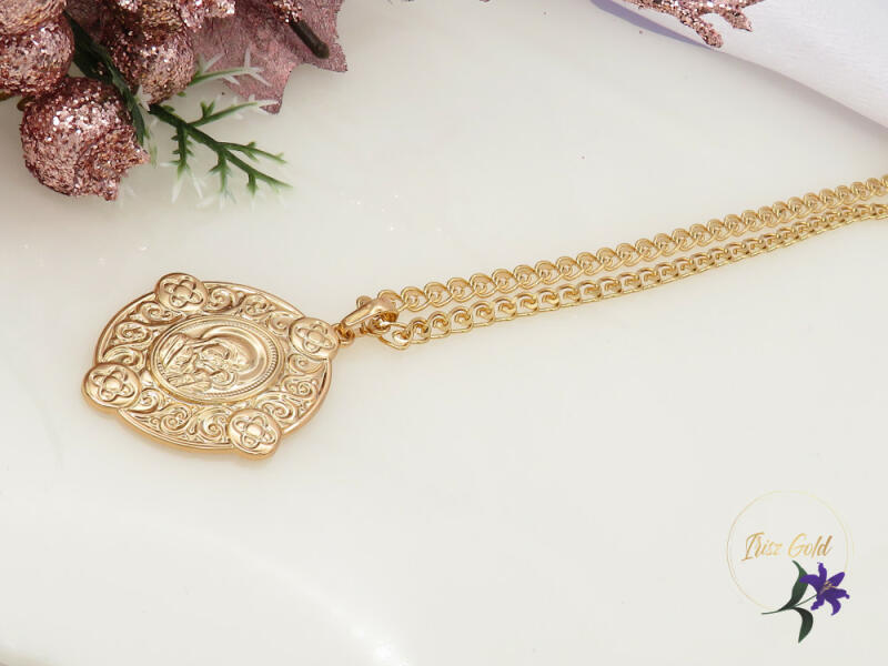 Antiallergén Vallási témájú medál gyönyörű hurokszerű szemekből álló nyaklánccal Szin: 18k aranyszínű Méret: 60 cm/4mm Medál:45x30mm A forgalmazott divatékszerek alapanyaga nikkel és ólommentes ezért többnyire nem okoznak allergiás tüneteket , nyugodtan hordhatják fémérzékeny emberek is. Általában nem színezik a bőrt és más divatékszerekhez képest nagyságrende