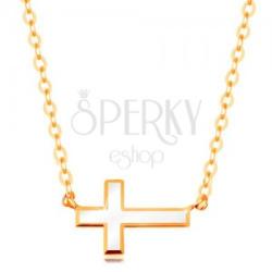 585 sárga arany nyakék, vékony fénylő nyaklánc, amely végeit egy fektetett kereszt medál kapcsolja ossze. A kereszt felülete fehér fénymázas. A nyaklánc hossza állítható, delfinkapcsos zárszerkezettel ellátva. Medál mérete: 9 x 6 mmSzélesség: 1 mmHossz: 410 mmHosszabbítható rész: 40 mmTeljes hossz: 450 mm (+/- 5%)Súly: 1,2 gFémjelzéssel ellátott.