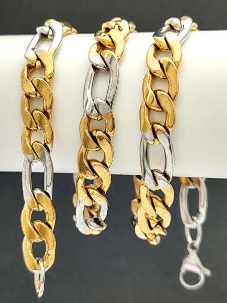 Arany-ezüst színű nemesacél (316L) figaro szemes nyaklánc. Minőségi anyagának köszönhetően nem színezi a bőrt, nem feketedik. Időtálló ékszer, amit fürdéskor sem kell levenni, bátran viselhető folyamatosan. Antiallergén ékszer. 14K arany-ezüst színben kapható. A nemesacél ékszerek rendkívül népszerűek kedvező tulajdonságaik miatt. A nemesacél semmilyen nikkelsót
