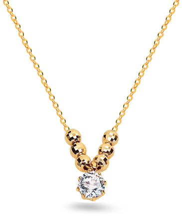 Minimalista nyaklánc sárga aranyból. A láncot összesen 6 gyöngy díszíti, csiszolt mintával és 5 mm átmérőjű, átlátszó cirkóniával. Az ékszer felületkezelése magasfényű.