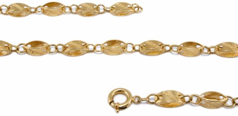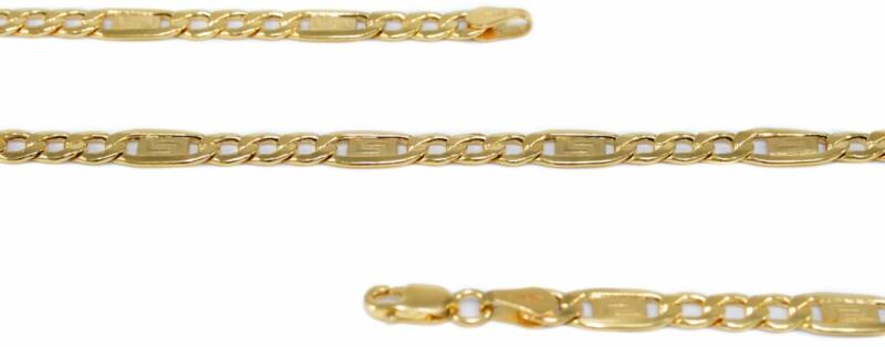 Klasszikus és kedvelt fazonú, üreges szemekből készült, de masszív, mutatós betétes, görög mintás aranylánc.