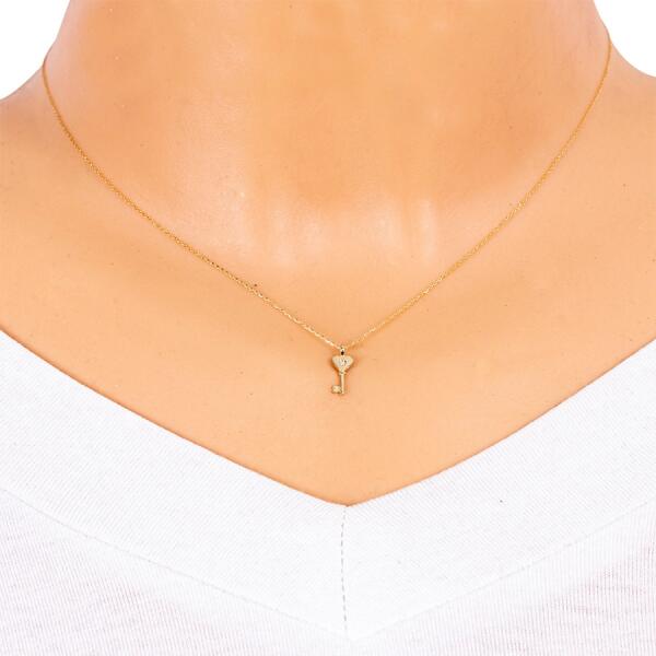 Az 585 sárga aranyból készült briliáns nyaklánc merőlegesen egymásra merőlegesen kapcsolódó apró láncszemekből álló lánccal. A medál egy kis kulcs, melynek feje egy sima, fényes szív díszít. A szív közepébe egy tiszta kerek gyémánt van beágyazva. A nyaklánc rugós gyűrűzárral rendelkezik. Medál mérete: 4 x 12 mm Gyémánt karát súlya: 0,006 ct Gyémánt átmér