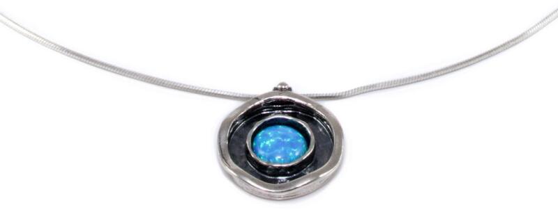 Kedvelt fazonú, kör alakú, antikolással, középen opállal (nem valódi) díszített ezüst medál kígyólánccal kombinálva.
