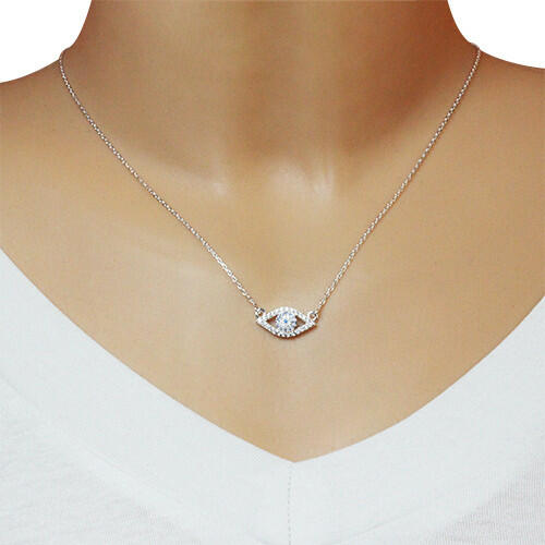 A medál mérete: 18 x 9 mmA lánc szélessége: 1,3 mmA nyaklánc hossza: 400 mm (+/- 5 %)A nyaklánc súlya: 2,8 gFémjel - Van. 925 ezüst nyaklánc szem alakú medállal díszített, melybe átlátszó cirkóniák vannak beágyazva. A szem közepén, az íriszben sötétkék szintetikus topáz van berakva. A medál az első elem, amely megragadja a tekintetet. Egyedi és fényűző darab, amel