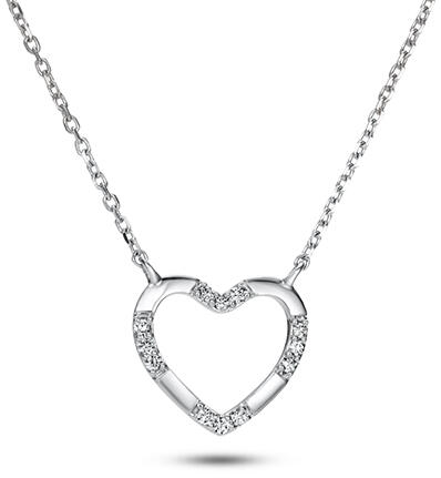 Ez a gyönyörű szív motívumos nyaklánc a szerelem és az elegancia gyengéd és romantikus kifejezése. Kiváló minőségű fehér aranyból készült. Fényes felülete tökéletes hátteret teremt a szív kerületét díszítő csillogó gyémántoknak. A szív kerületét egy sor természetes briliáns csiszolású gyémánt díszíti, amelyek összsúlya 0,05 karát. A klasszikus kerek f