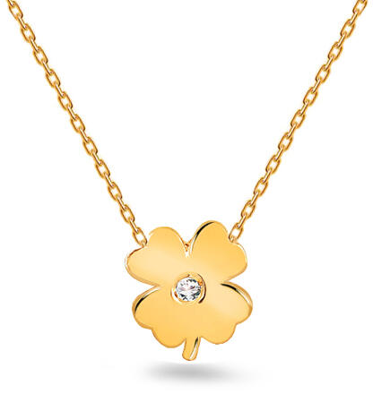 Arany nyaklánc 9 karátos sárga aranyból. A finom láncot négylevelű lóhere-medál díszíti, amely kiemelkedik egy 0,006 ct össztömegű gyémánttal, melynek színe H tisztasága SI1. A gyémánt tanúsítvánnyal rendelkezik.