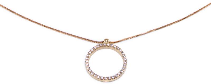 Modern stílusú, kedvelt fazonú, cirkónia kővel ékített, kör medállal díszített, vékony kocka arany nyakék.