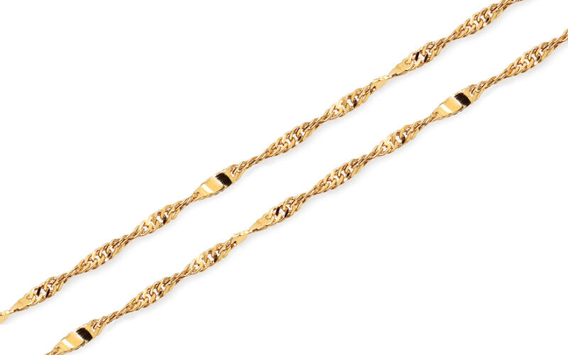 Elegáns Valis lánc sárga aranyból. A lánc géppel kötött kötélre emlékeztető mintából és finom lemezekből áll. A lánc felülete magasfényű.